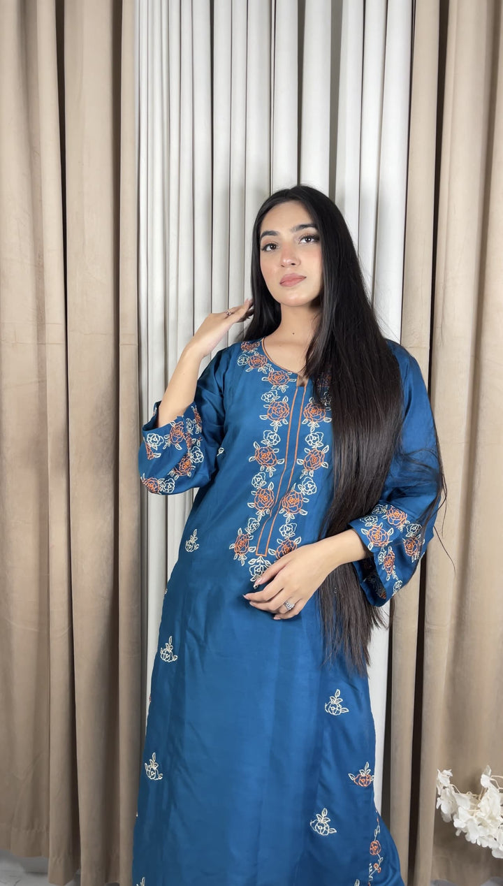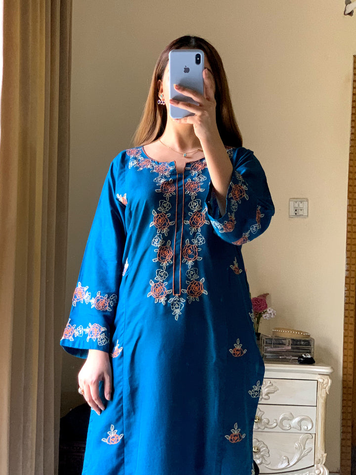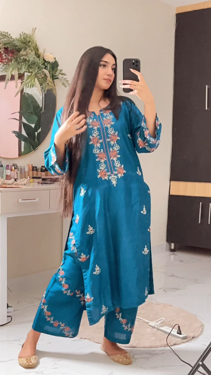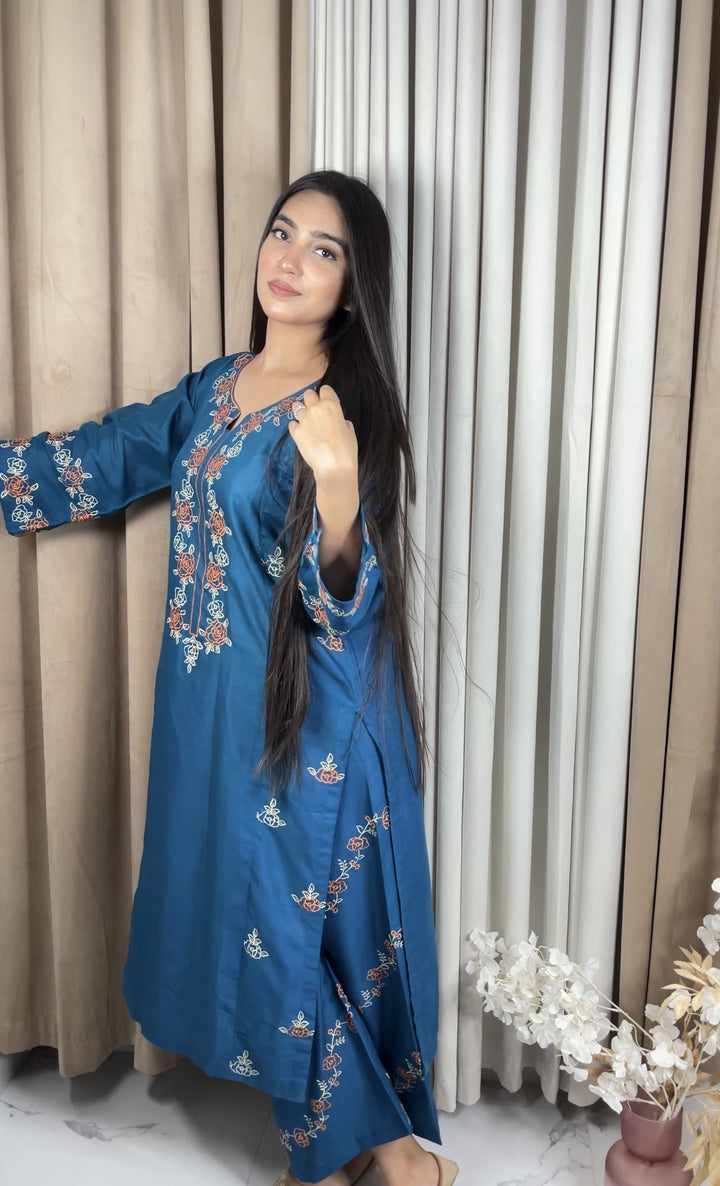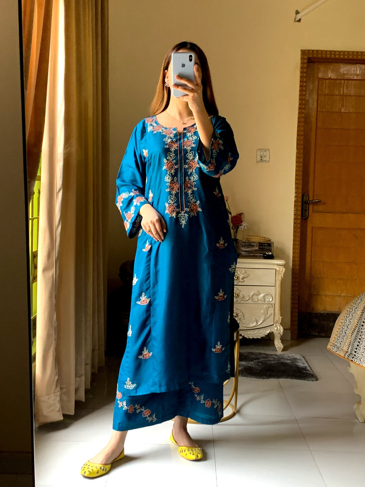 - *Description:* Embroidered Shirt with Embroidered Plazo, Overlocked for a perfect finish.