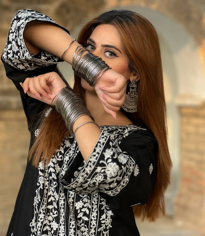 *LONG NECK Embroidery* Round Shirt With *PLAZO*